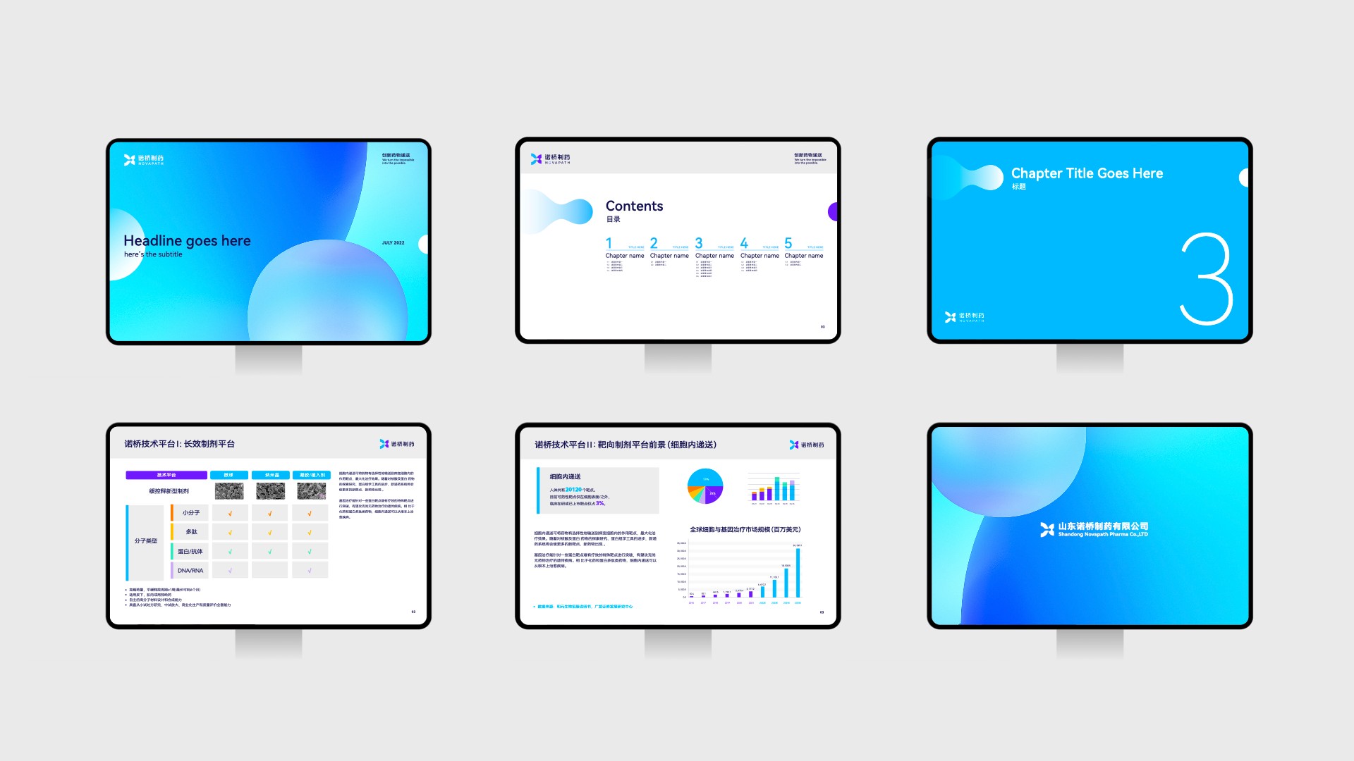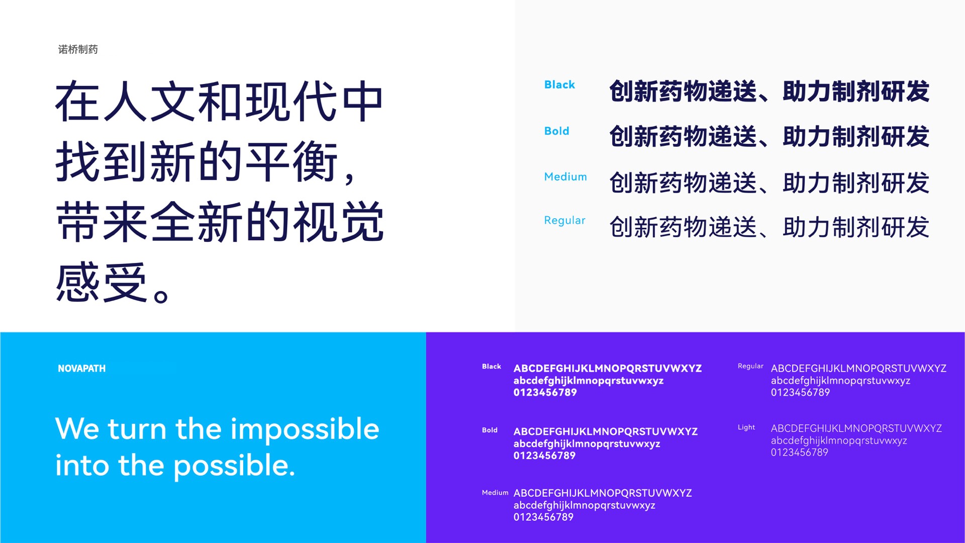 在諾橋制藥品牌塑造項(xiàng)目的初期,煥識(shí)團(tuán)隊(duì)與諾橋內(nèi)部的高層、市場(chǎng)相關(guān)人員進(jìn)行了多次的深度訪談?wù){(diào)研工作,深入了解到諾橋制藥努力成為中國(guó)最具價(jià)值的全球一流的藥物遞送創(chuàng)新技術(shù)公司的企業(yè)愿景。經(jīng)共同討論,提煉出了關(guān)鍵性描述:諾橋制藥品牌就像一座橋梁連接了成功的彼岸,把已有技術(shù)發(fā)展為更好的技術(shù),把未能達(dá)到的技術(shù)變成可能。我們?cè)谶@關(guān)鍵性描述定義的指導(dǎo)下,為諾橋制藥提出了全新的品牌視覺(jué)概念語(yǔ)言:“成功新通道”。根據(jù)這一概念,我們開(kāi)發(fā)了諾橋制藥品牌的視覺(jué)形象。其中,諾橋的圖形標(biāo)志靈感來(lái)自于諾橋團(tuán)隊(duì)分享的科研資料中“脂質(zhì)體技術(shù)”在靶向給藥過(guò)程中的藥物分子遞送狀態(tài),我們進(jìn)一步對(duì)此抽象概念語(yǔ)言進(jìn)行了可視化的具像呈現(xiàn)。用左右兩邊半圓之中的液體流動(dòng)輪廓表現(xiàn)了在藥物遞送過(guò)程中有方向性的、具有穿透感的藥物遞送瞬間。同時(shí)此圖形標(biāo)志整體也構(gòu)成了字母“N”的形狀,賦予諾橋制藥(NOVAPATH)更多的品牌專屬性和識(shí)別性。